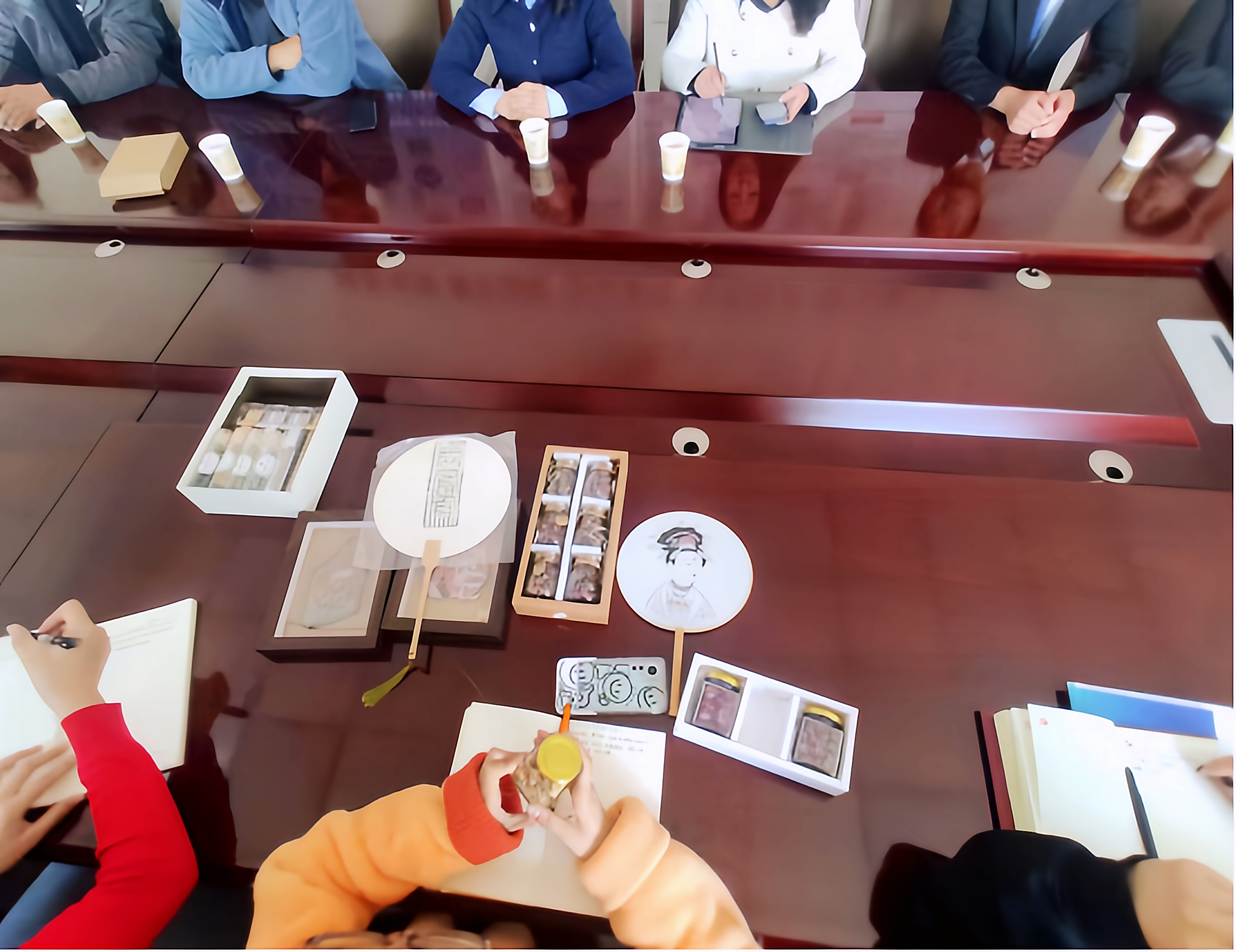 随后,师生将独具匠心的文创产品进行一一展示,本次带来的具有鲜明特色的文创产品分别有师生纯手工扎染扇子、戈壁玫瑰花瓣茶、风雨石艺术画、岩画、泥版画以及我校科研团队从培育出无农药残留的戈壁玫瑰中提取的玫瑰精油等。
